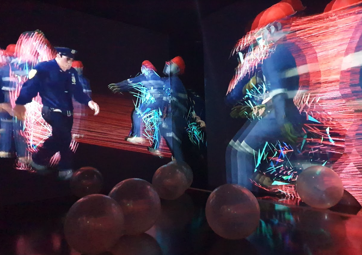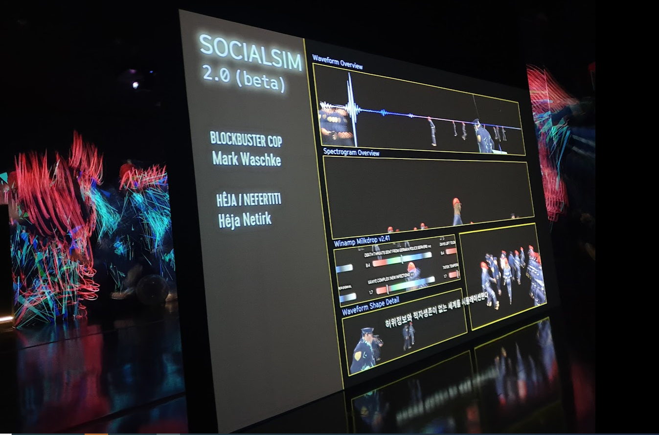 전시의 하이라이트는 <소셜심>'(2020,18분 19초) 이다. 화면에는 춤추는 경찰 아바타가 등장한다. 전시장은 어디서 흘러나오는지 모르는 댄스 음악과 싸이의 ‘강남스타일’과도 같은 화면속 캐릭터 움직임이 하나의 느낌으로 압도해 온다. 화면 속 경찰들 춤은 팬데믹 이후의 대중의 시위와 이를 진압하는 경찰과 군인들의 행위를 데이터로 변환한 것이라 한다. 아이러니컬하게도 모션캡쳐의 기술을 사용하여 하나의 역사적 사실을 데이터화한 것이다. 2020년 시위 현장의 사망자, 부상자, 실종자 수 등의 다양한 데이터가 쓰인 것이다.