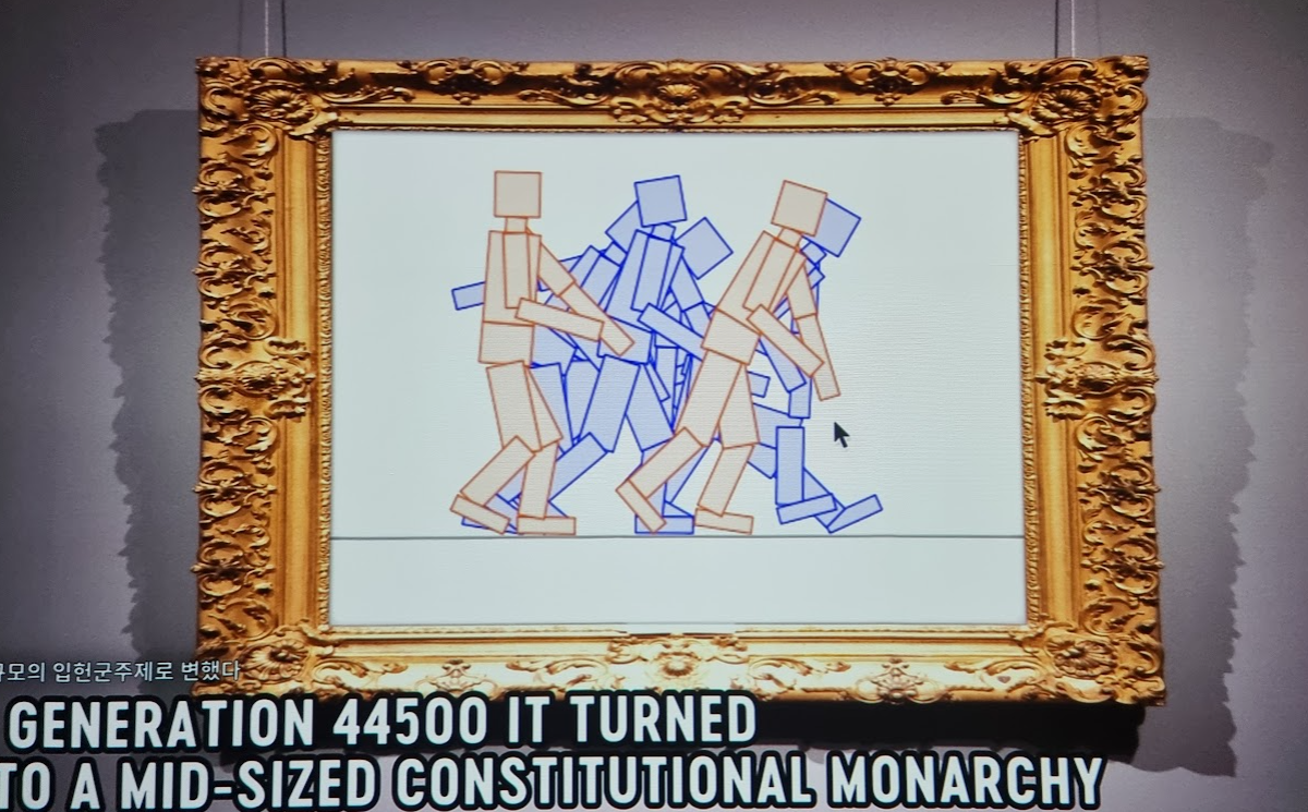 두 번째 전시방에는 ‹살바도르 문디›라는 도난된 미술 작품을 찾는 태스크포스 이야기 상영된다. 레오나르도 다빈치가 그린 것으로 알려진 작품을 되찾기 위해 가상의 전시공간으로 투입되고 신경망 네트워크와 인공지능이 만들어내는 미술들을 만나게 된다. 알 수도 없는 이야기가 단발마와 같은 나레이션에 의해 전개되고 우리는 막연히 가상의 세계와 마주하게 된다. 이것이 메타버스인 것이다. 투명한 공과 같은 의자에서 음악에 맞추어 몸을 구르다 보면 우리는 어느 사이엔가 가상현실 속으로 연결된다.